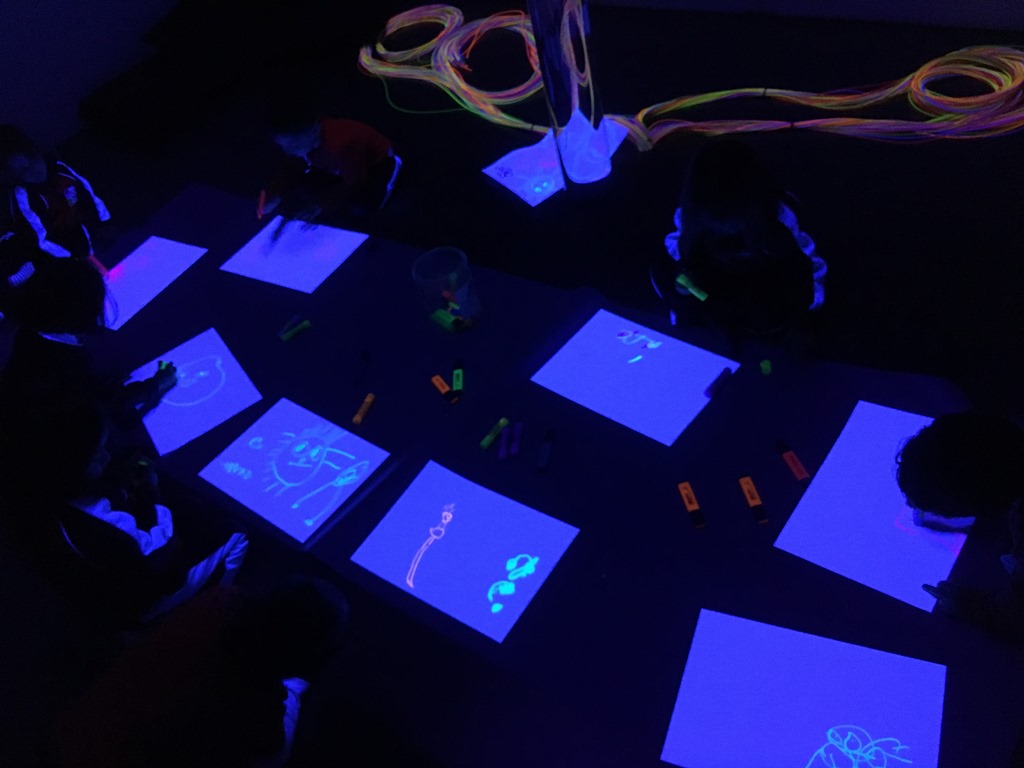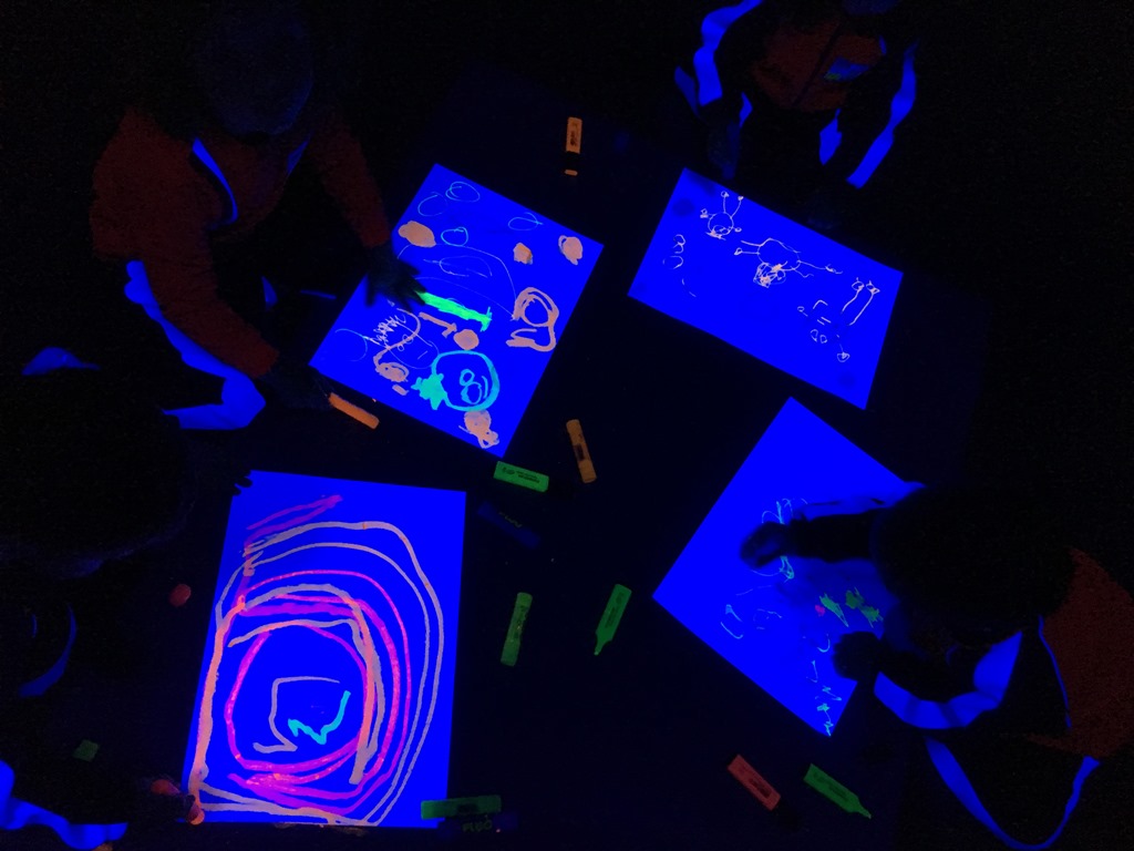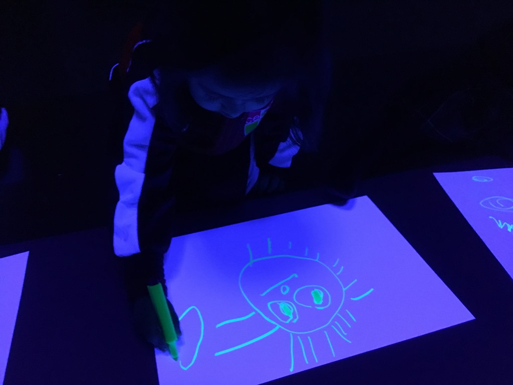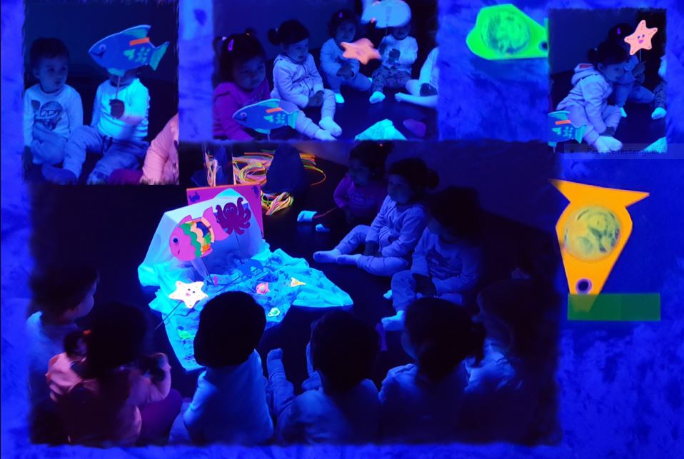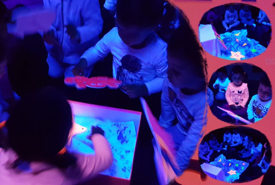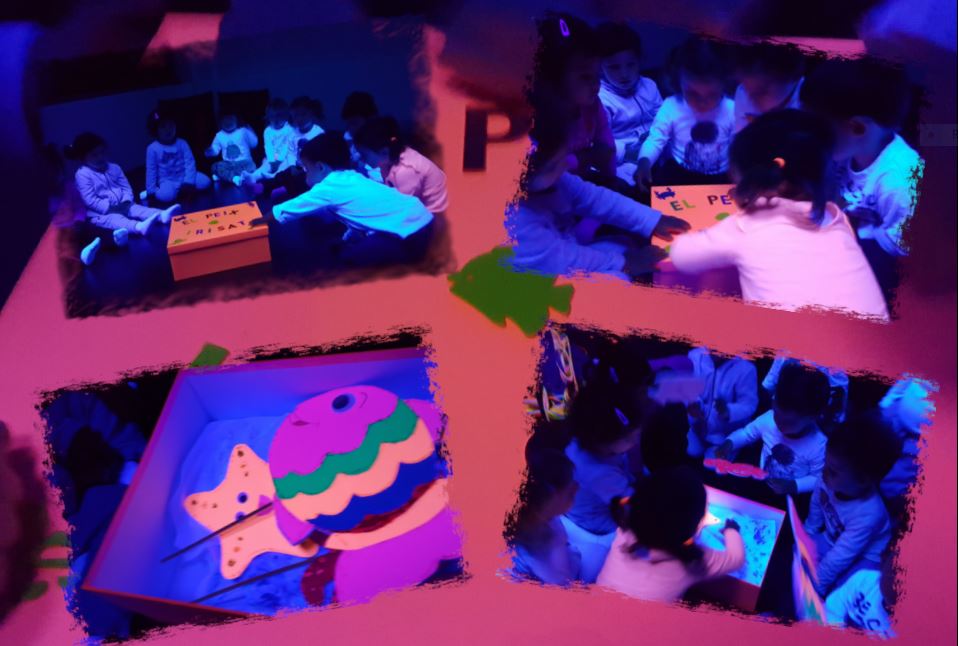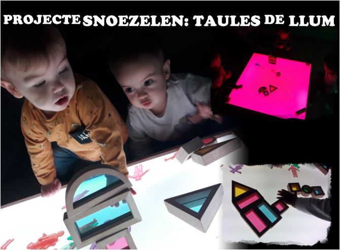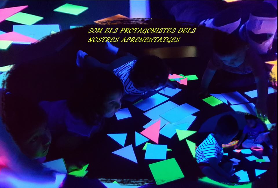 Cada sessió a l’aula Snoezelen ens aporta molta relaxació i benestar a través dels estímuls sensorials; música, llum.... Aquesta vegada el material ficat a l’abast dels infants han estat unes formes geomètriques fluorescents, iniciant així el reconeixement de qualitats, semblances, diferències..., i fent al infant el protagonista dels seus aprenentatges significatius.